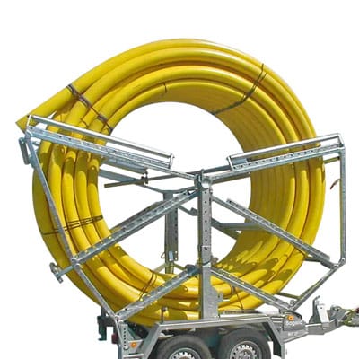 Släpvagnarna i BKT-serien är användbara för transport av HDPE-rörtrummor, kabeltrummor, rörslingor, lastplattformar och en duktbom för upp till 9 mindre trummor.
